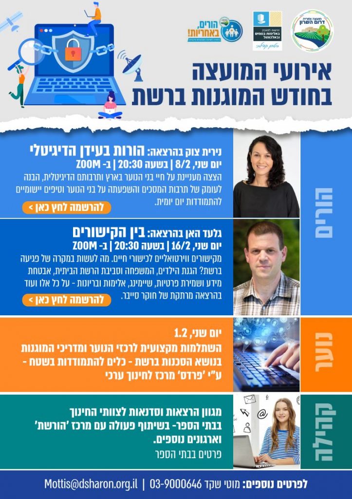 ביום שלישי מתקיימת הרצאת זום של גלעד האן. מומחה לתחום הסייבר ופגיעות ברשת. להרצאה יצטרף גם ישעיהו קצין הנוער בתחנת כפר קאסם, להסבר ושאלות.
