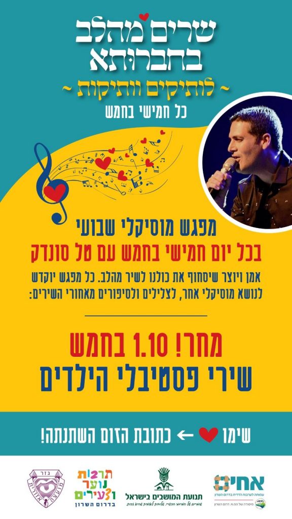 יום חמישי, 1.10.2020 בשעה 17:00 לשירה בחברותא עם טל סונדק – אמן ויוצר שיסחוף את כולנו לשיר מהלב.