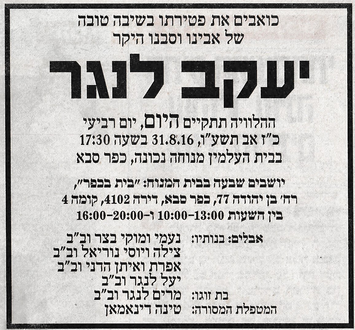 דברים לזכרו ועל תולדות חייו של יעקב לנגר מאת בנותיו בהלוויה 31.8.2016