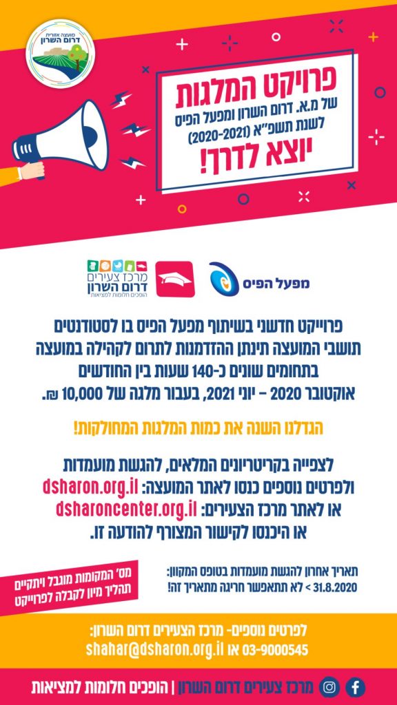 נרגשים לספר כי ההרשמה להגשת מועמדות לפרוייקט המלגות של מועצה אזורית דרום השרון ומפעל הפיס לשנת תשפ״א (2020-2021) נפתחה! 👏🏼🥳